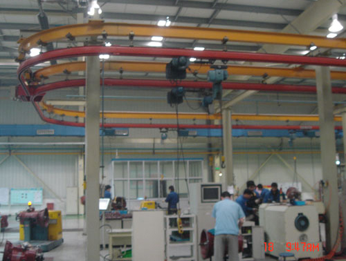 該設(shè)備適用于物料(工件)的線性輸送,根據(jù)用戶對物料輸送的傳遞、分配要求,可以組合成直線的、環(huán)形的、分岔的等多種形式的單軌輸送線網(wǎng)絡(luò)。通過采用直線、彎軌、道岔、轉(zhuǎn)盤實(shí)現(xiàn)軌道上輸送物料的任意走向。實(shí)現(xiàn)往返輸送作業(yè)和環(huán)形輸送作業(yè)。輸送線長度不受限制,可以是簡單的手動控制直線環(huán)形軌道、也可以是多分支的半自動或全自動控制的環(huán)形軌道,并可以實(shí)現(xiàn)全線供電、也可以實(shí)現(xiàn)分段供電,使每一個運(yùn)行小車均成為自行驅(qū)動行走的輸送單元。